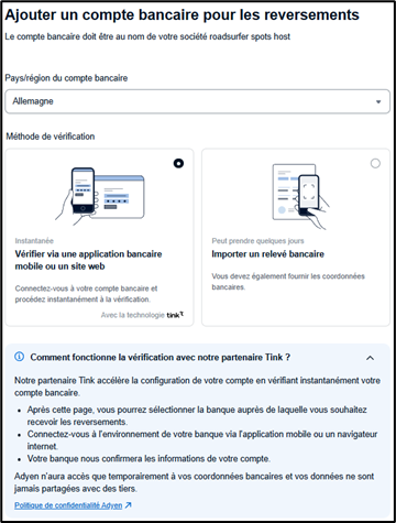 • Le pays/la région où le compte bancaire est situé. Pour les relevés bancaires de l'UE, Adyen déduit le pays/la région à partir de l'IBAN.