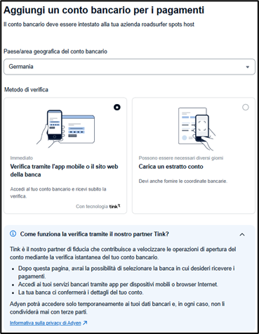 - Il paese/regione in cui si trova il conto bancario. Per gli estratti conto bancari dell'UE, Adyen deduce il paese/regione dall'IBAN.